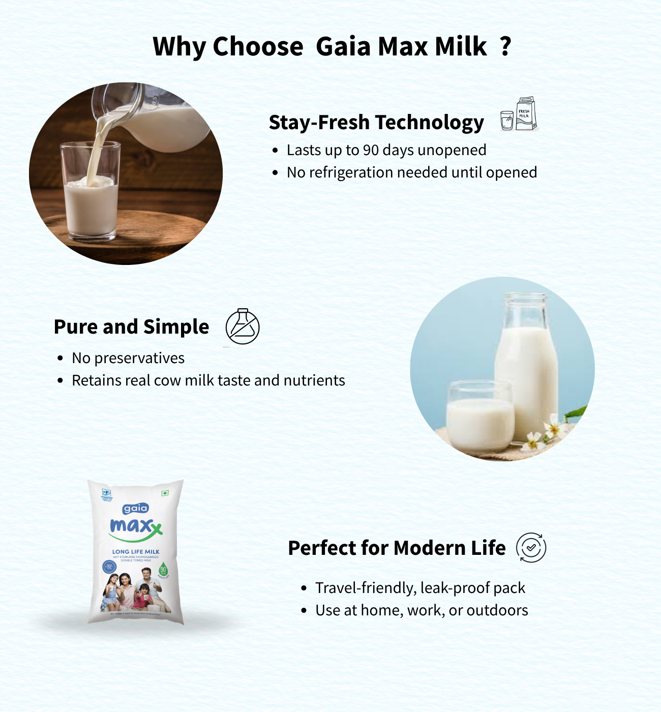 ESL Milk is packed in a high-quality tetra pack that preserves its freshness, purity, and extended shelf life without refrigeration until opened. Using Extended Shelf Life (ESL) technology, it effectively reduces bacteria while maintaining essential nutrients, making it a safe and healthy choice. It contains no added water, milk powder, preservatives, or chemicals, offering the natural goodness of fresh milk. The convenient, spill-proof packaging is perfect for easy storage and travel. No need to boil—just open and enjoy. Once opened, store in the refrigerator and consume within two days.